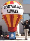 A Compact Solution To Your Huge Advertising Needs. Try our ‘Mini-Rotatables’ specialty display product. This invaluable spinning inflatable has swept away the nation with its diverse applications. Whether indoors or outdoors, the ‘Mini-Rotatables’ will continuously spin your featured promotion, product replica, event or text message 360 degrees! . The ‘Mini Rotatables’ are versatile enough to be used in many applications, from Grand Openings; Sales; Sporting Events; Special Events and Parades the applications are endless. The ‘Mini Rotatables’ can be simply installed in less than 5 minutes, since they require no tie-downs or stakes. Our built in dolly system virtually eliminates any lifting. If you have ever imagined the ideal marketing tool, then ‘Mini-Rotatables’ is your answer. What helps make this product especially unique is its ability to be displayed at eye level, and draw attention from every corner. If your location is surrounded by adjacent businesses, ‘Mini-Rotatables’ can help draw hundreds to you simply by the motion generated with our unique ‘One of a Kind’ renowned and patented rotating device. For example, with our popular hot air balloon design, clients can either display one banner the circumference of the balloon or utilize two separate banners with graphic images and/or text. In fact, according to ‘Sign of the Times’ magazine …at least 90% of audiences are drawn to motion and signage with movement versus static forms of advertisement. With this in mind, it is no wonder why the effectiveness of the ‘Rotatable Inflatables’ and its smaller counterpart ‘Mini-Rotatables’ have taken off with enormous success. And, best of all, if you are seeking versatility in your next advertising tool, consider if you will the option to display the ‘Mini-Rotatables’ for nighttime illumination, that’s night time exposure to your business and services. The internal light system on your ‘Mini Inflatable’ is just another added feature that sets it apart from any other product currently in the market. Due to an overwhelming response of the original ‘Mini-Rotatables’ multicolor hot air balloon design, we have increased our inventory to stock the latest and most visually stunning custom designs. From Seasonal Inflatables, Custom Shapes to actual miniature Product Replicas, allow ‘Mini-Rotatables’ to work wonders for your business or bring an added dimension of animation to your special events. For more information on how you can own or rent the ‘Mini-Rotatables’, please contact our staff at (626) 579-1772.